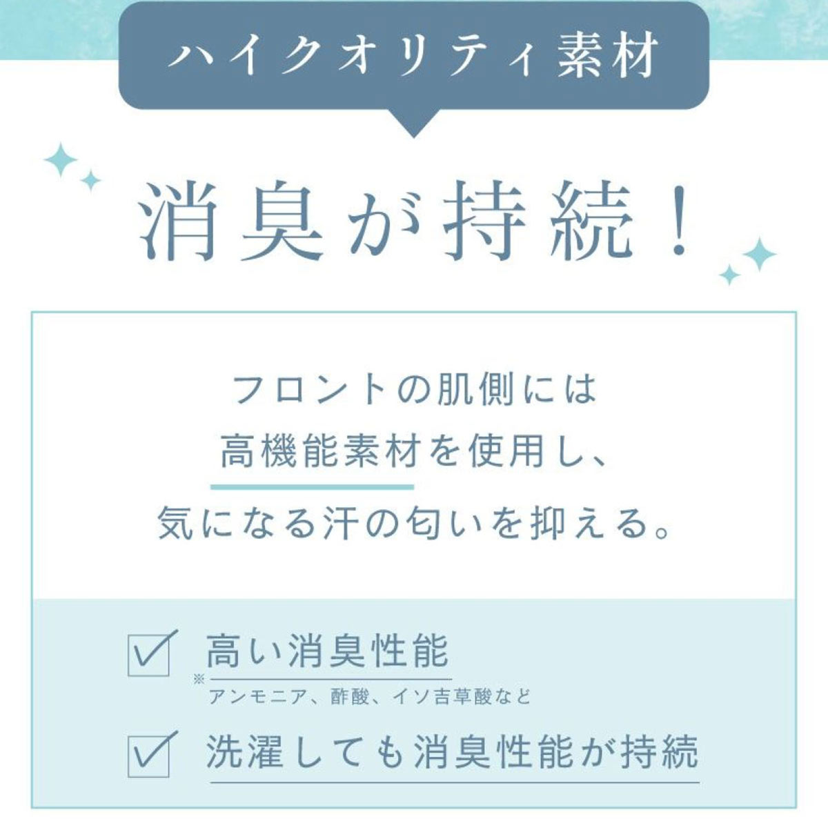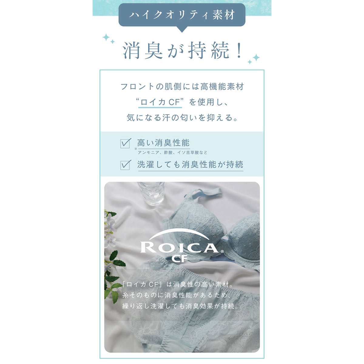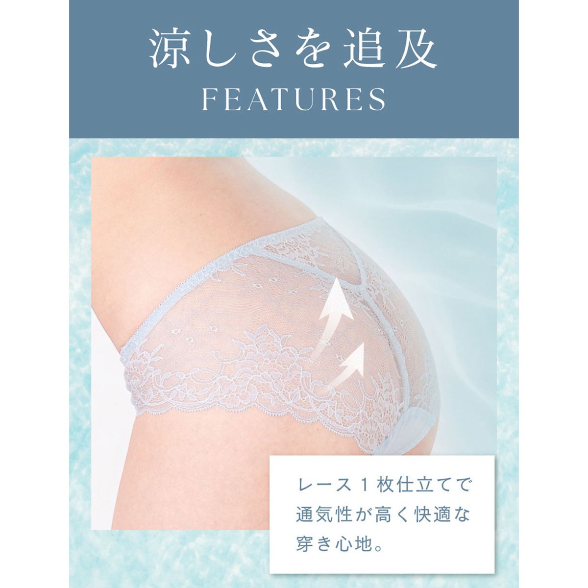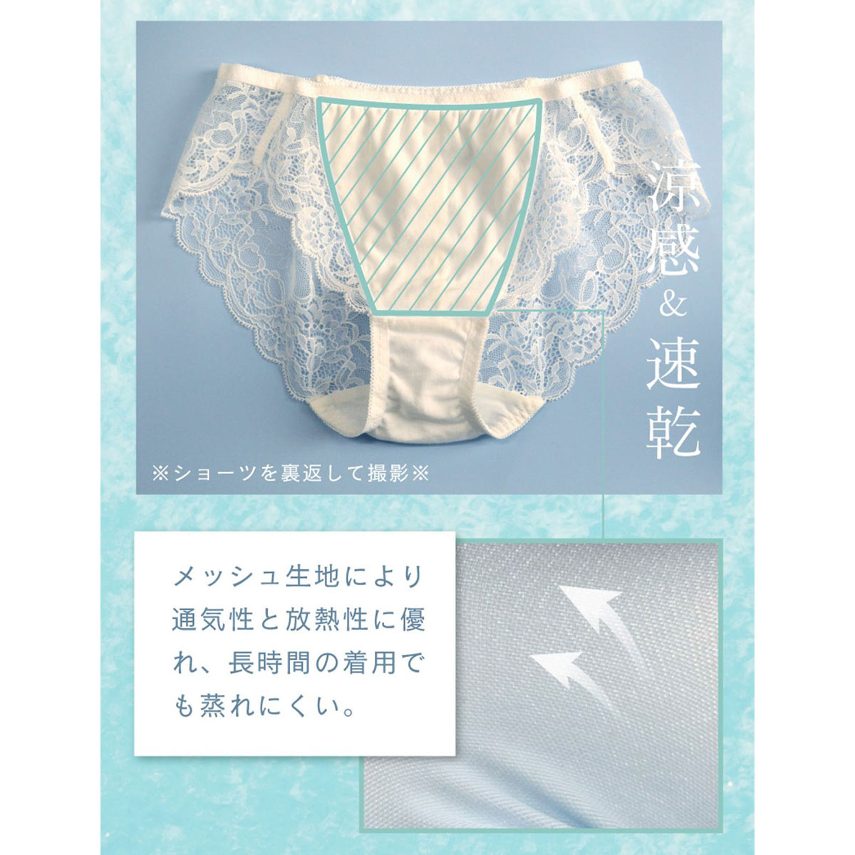 総レースタイプでボトムスに響きにくく、蒸れにくい素材で履き心地は抜群。夏のお悩みである汗やニオイに対応できる機能素材を採用し、快適な着用感をキープします。