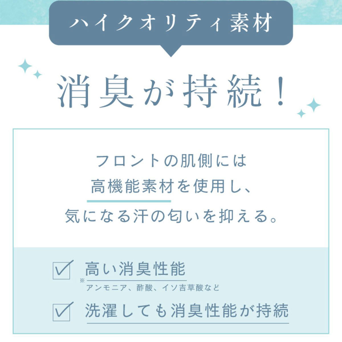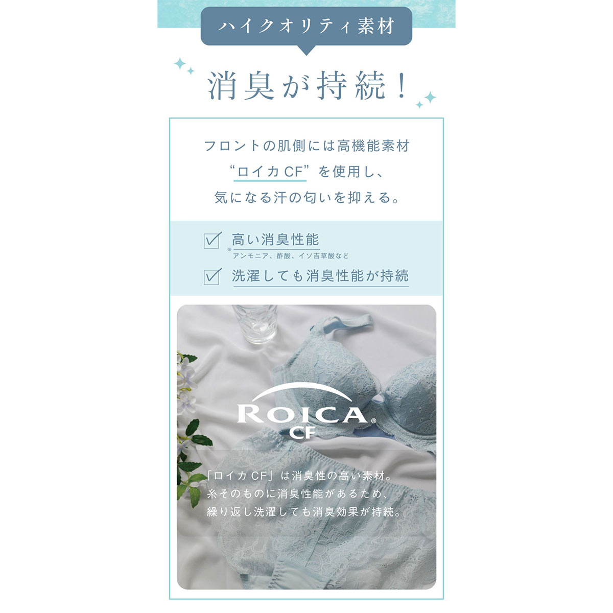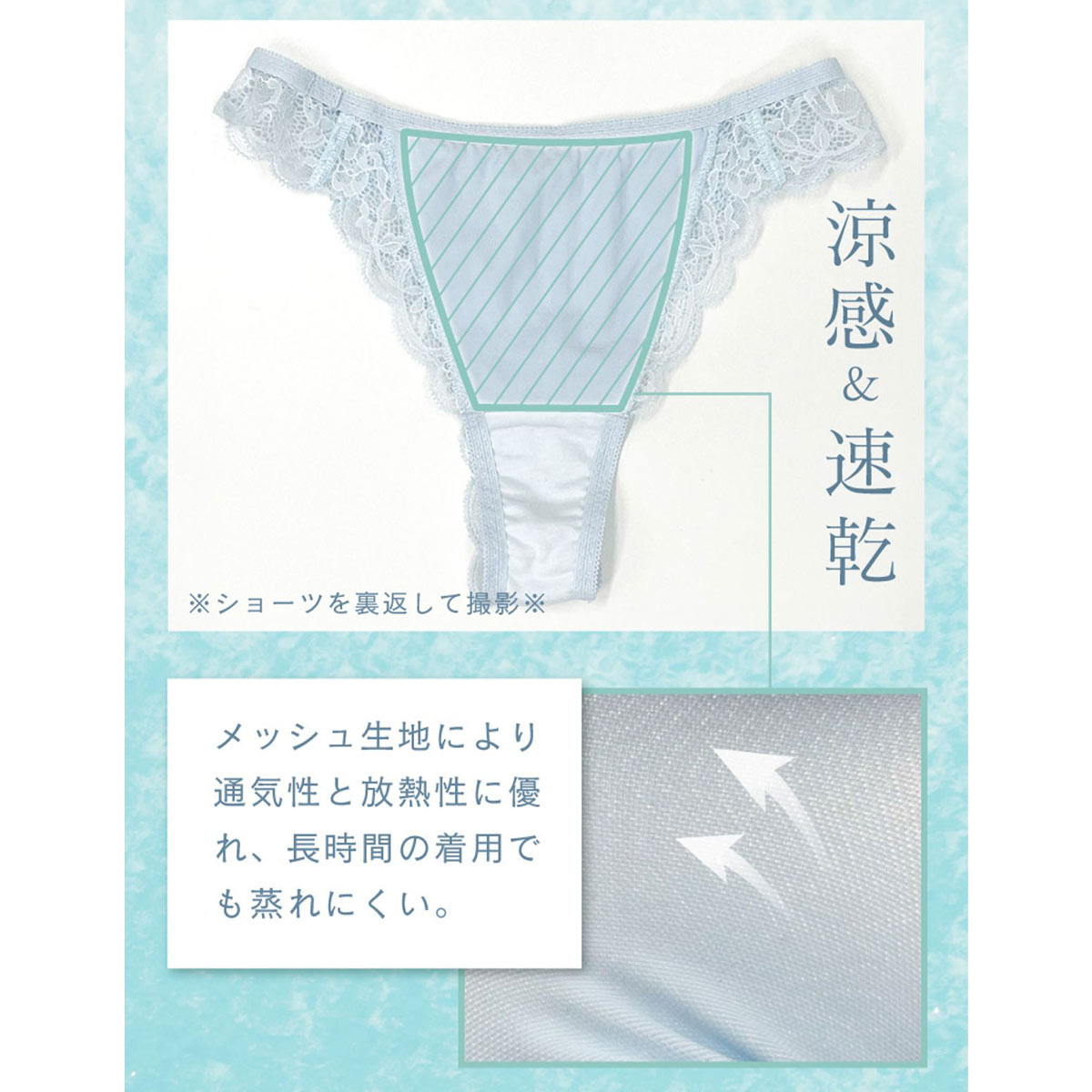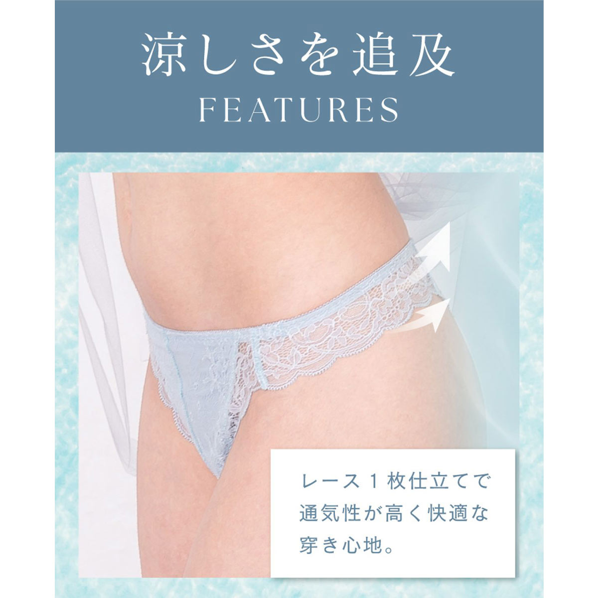 薄手の総レースでボトムスに響きにくく、通気性も抜群で蒸れにくい履き心地。夏のお悩みである汗やニオイに対応できる機能素材を採用し、快適な着用感をキープします。