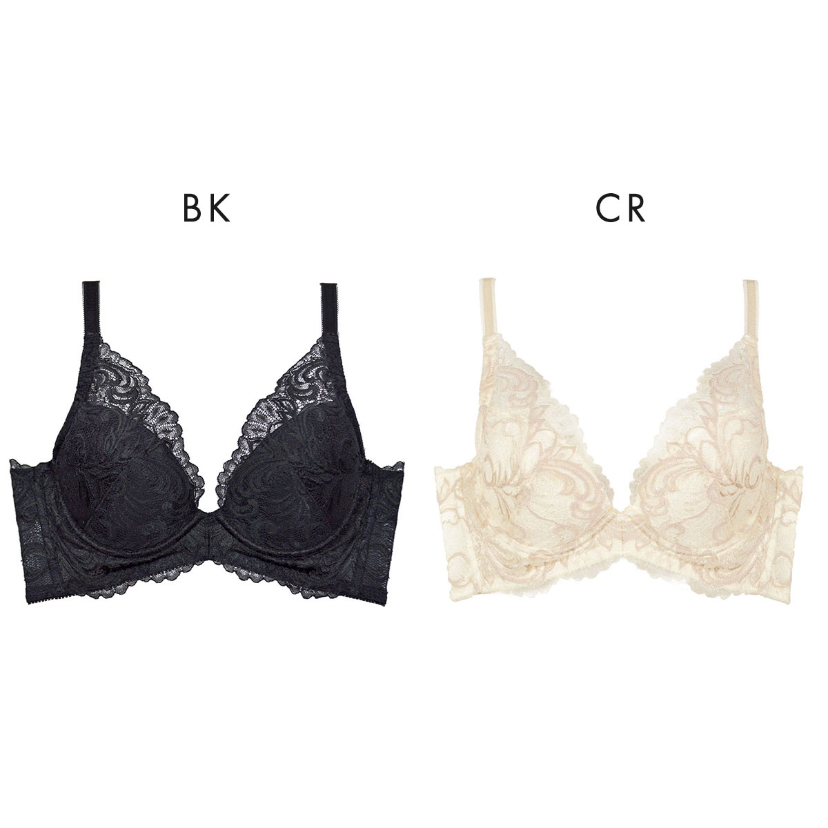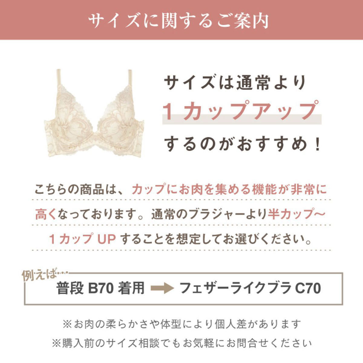 立体的で華やかなフェザー模様の総レースを前面に覆いかぶせ、高級感を引き立てました。計算された3つの補整力で、脇や背中に流れたお肉をカップへ集め、下がり気味のバストを上向き立体バストへ導きます(着用中の効果による)。