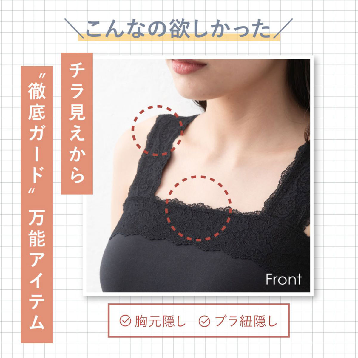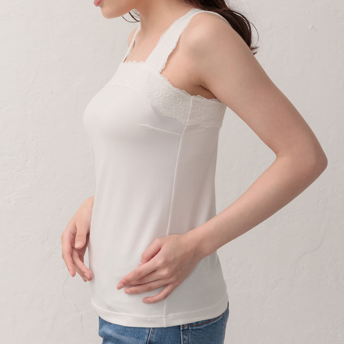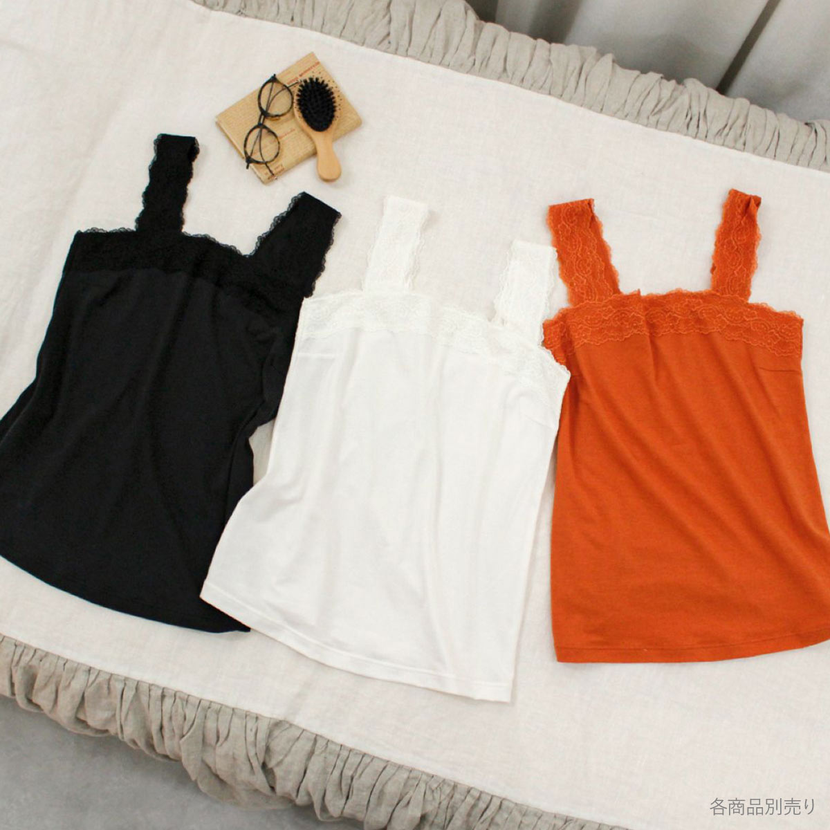 デコルテを綺麗に見せながら、レース素材によりファッション性アップ。暑い日にはこれ1枚でお家でのリラックスタイムにも。デコルテをキレイに見せるスクエアネックもポイントです。