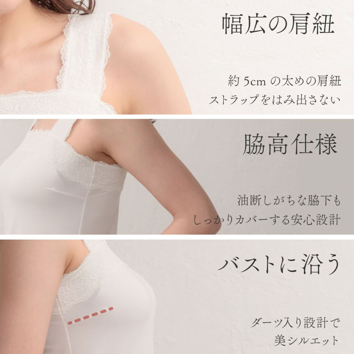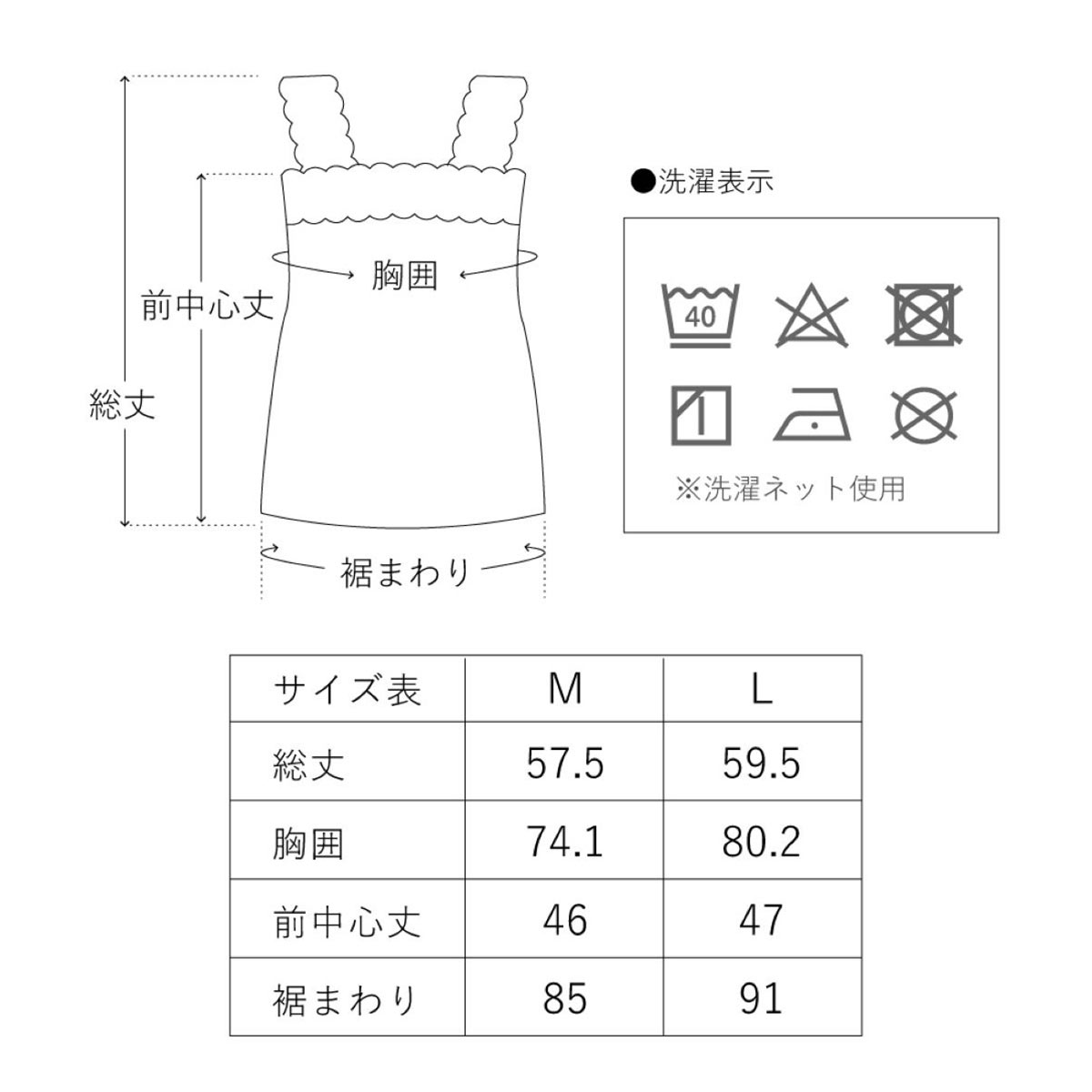 | 仕 様 | ・身丈:Mサイズ約57.5cm、Lサイズ約59.5cm(※裾レース含む置き寸法) ・身生地2WAYに伸縮性あり ・肩紐調整:不可 ・カップ:なし |